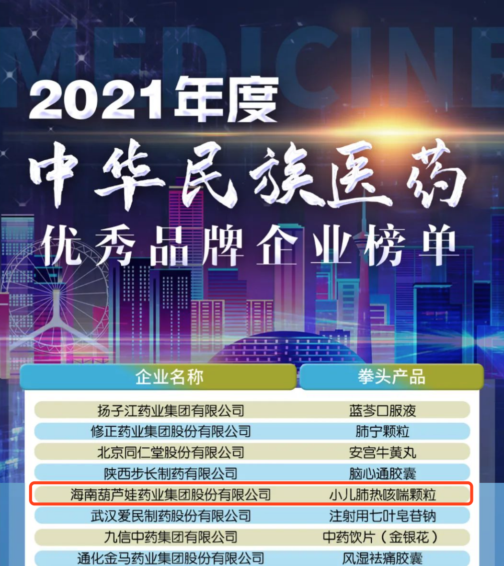 12月29日,全国工商联医药业商会发布了“2021年度中华民族医药优秀品牌企业榜单”,k豆钱包药业集团凭借黄金单品小儿肺热咳喘颗粒(4克)实力登榜。